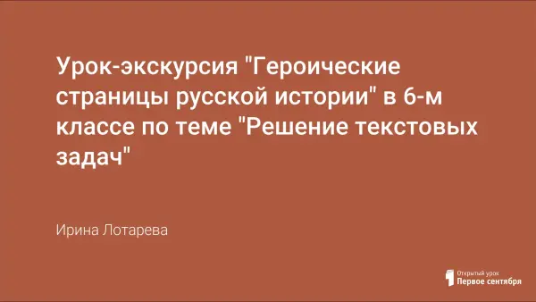 Урок проходит в форме экскурсии по музею «Бородинская панорама». Включает в себя следующие этапы: устный счет, самостоятельная работа, изучение новой темы, обучающая самостоятельная работа. Задания ко всем этапам урока подобраны с использованием исторического материала. На уроке используется мультимедийная презентация, позволяющая активизировать внимание учащихся.
