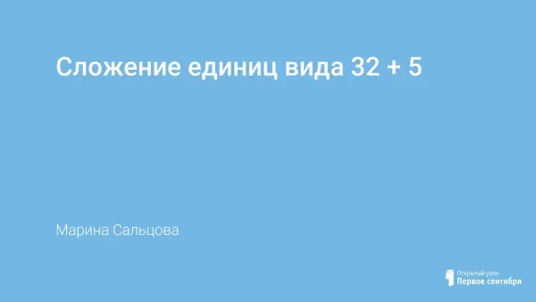 Данный урок по типу является уроком открытия нового знания, цель которого – научиться находить значение выражений нового вида 32+5. Формировать у детей представление о способе сложения двузначных и однозначных чисел, когда десяток не изменяется. Урок состоит из девяти этапов, логически связанных между собой. Ребёнок не получает знаний в готовом виде, а добывает их в процессе поиска.