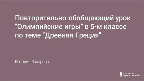 Урок представлен в игровой форме. Ученики выступают в роли участников состязаний Олимпийских игр: выполняя задания на знание истории Древней Греции, «соревнуются» в беге, прыжках, борьбе, метании копья и диска, гонках колесниц. Урок позволяет не только проверить знания учащихся по теме, но и способствует пропаганде физической культуры и занятий спортом.
