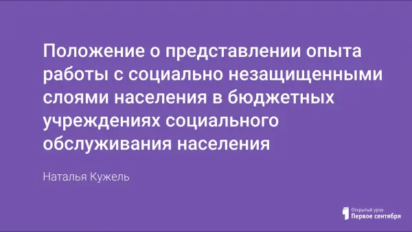Вопрос обобщения опыта работы специалистов социозащитных учреждений мало изучен и требует исследований. Автор статьи предлагает один из вариантов систематизации, обобщения, изучения и в конечном результате ‒ представления опыта работы специалистов социальной сферы (социального обслуживания населения).