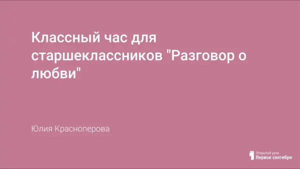Классный час является авторской разработкой, ориентирован на учащихся 9–11-х классов. Дает детям возможность поговорить о тех вопросах, которые их волнуют в данном возрасте, но не сводить понятие «любовь» лишь к любви мужчины и женщины.