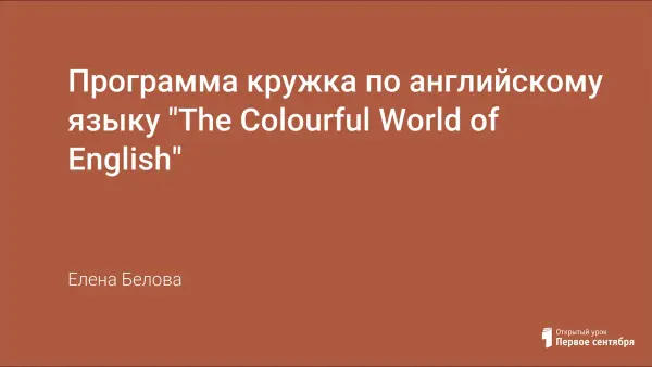 Предлагаемая программа кружка “The Colourful World of English” способствует формированию межкультурной компетенции путём системной реализации социокультурного компонента обучения английскому языку.