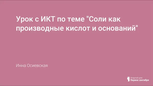 Урок с ИКТ проводится с использованием ПК и экрана. В слайдах представлены материалы, необходимые для проведения урока, они экономят время при проведении опроса и в наглядной форме демонстрируют процесс формирования солей, облегчая усвоение нового материала.