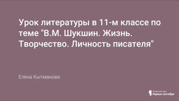 В представленном уроке рассматриваются вопросы, которые поставил Василий Шукшин и решать которые завещал нам. Также мы поговорим о жизненных уроках Шукшина: о способе жить в искусстве, о позиции художника. Его творчество, несомненно, зовёт к спору, к обсуждению и в наши дни.