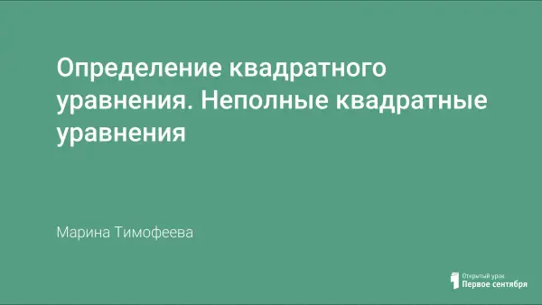 Урок объяснения нового материала. Цель урока: знакомство учащихся с общим видом квадратного уравнения, понятием неполного квадратного уравнения и способами решения квадратных уравнений. На уроке объясняется, что источником возникновения квадратных уравнений является реальный мир, что они возникли из практических потребностей людей, рассматриваются решения неполных квадратных уравнений, также квадратного уравнения с параметром, сводящегося к решению неполного квадратного уравнения.