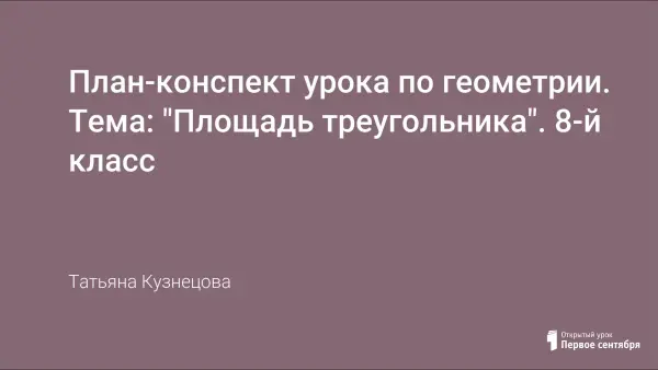 Урок геометрии в 8-м классе по теме "Площадь треугольника" к учебнику Л.С. Атанасяна. На уроке используется технология развивающего обучения с использованием цифровых образовательных ресурсов. Систематизация знаний по теме: "Площадь", вывод формулы для площади треугольника и двух следствий из нее, совершенствование навыков решения задач.