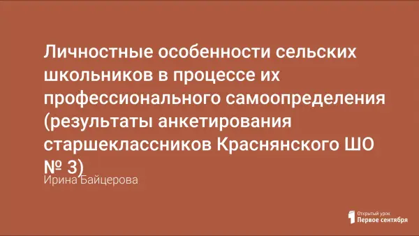 Выбор профессии, который школьники делают в подростковом и юношеском возрасте, является выбором между способом адаптации человека к социуму, с одной стороны, и возможностями высвобождения внутренних ресурсов развития личности – с другой. Неопределенность знаний о профессии и несоотнесенность их с собственными возможностями и желаниями приводит к тому, что старшеклассники часто выбирают на самом деле не профессию, а место работы (учебы), компанию друзей, желаемый образ жизни, который, по их представлениям, обеспечивает та или иная профессия. Об этом рассказывают результаты анкетирования, проведенного в сельских школах Краснянского ШО №3.