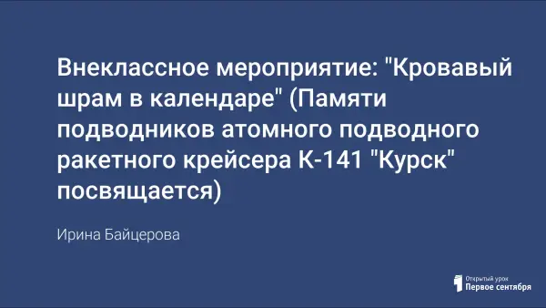 В августе 2000 года в Баренцевом море погибла подводная атомная лодка «Курск». Новейшая и абсолютно, по отзывам специалистов, надежная. Погибли 118 человек. Трагедия субмарины стала темой многих книг, театральных постановок, фильмов и… легенд. На протяжении всего мероприятия на экране демонстрируются слайды с фотографиями АПЛ, её экипажа. Звучат песни о русских подводниках, их непростой службе и верной дружбе.