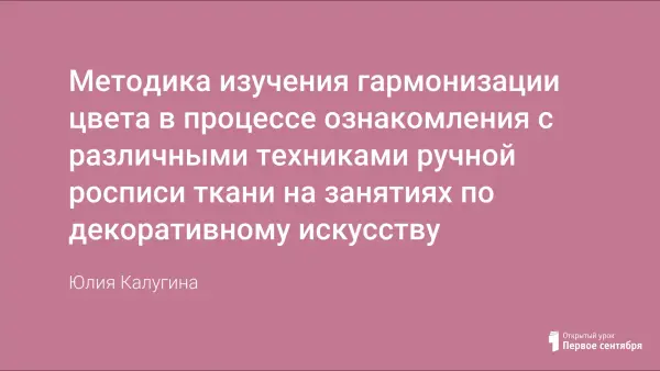 Тема "Гармонизация цвета" изучается в тесной взаимосвязи с освоением технологии ручной росписи ткани. Большинство заданий, направленных на усвоение знаний о тоновых отношениях при работе на ткани, обычно связаны с техникой горячего батика. В результате изучения блока тем, связанных с гармонизацией цвета в работах по росписи ткани, учащиеся могут научиться сознательно подходить к выбору цвета в своем творчестве, грамотно решать колористический строй декоративной композиции.