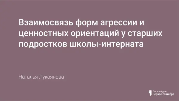 Рост агрессивных тенденций, распространение насилия и жестокости, отмечаемые в подростковой среде, вызывают озабоченность педагогов и психологов. Исследование проводится с целью выявления взаимосвязи форм проявления агрессии и ценностных ориентаций старших подростков школы-интерната и разработки системы занятий по формированию ценностных ориентаций у старших подростков с разными формами агрессии.