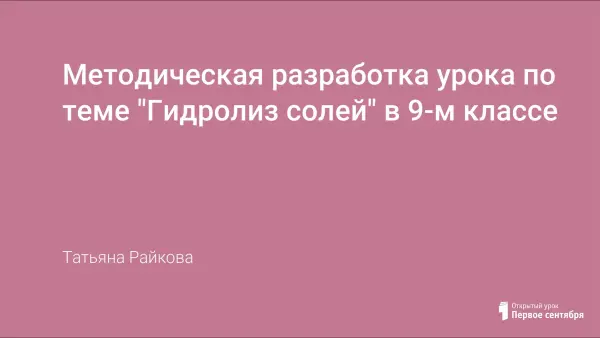 Урок расширяет и углубляет знания учащихся о химических свойствах солей, их особом свойстве, гидролизе. Учащиеся обучаются записывать уравнения в ионном виде, определять соли, подвергающиеся гидролизу, определять характер среды растворов солей при гидролизе.