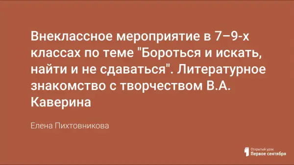 Литературное знакомство с творчеством В.А. Каверина может проводиться в библиотеке как внеклассное мероприятие и использоваться как дополнительный материал к уроку географии. Мероприятие рассчитано на учащихся 7 — 9-х классов, знакомит с творчеством В.А. Каверина и с историей освоения русского Севера в начале XX века.