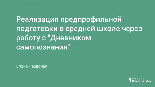Профессиональное самоопределение - важный и ответственный шаг в жизни подростка, поэтому в среднем звене в нашем образовательном учреждении в процессе предпрофильной подготовки в 7—8-м классах эффективным средством является "Дневник самопознания". Работа школьников с дневником способствует не только изучению личностных интересов и способностей, но и совершенствует личностные качества подростков - самостоятельность, ответственность, способность к самоанализу.