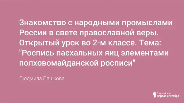 Урок имеет целью укрепить православную веру в детских сердцах, укрепить любовь к Родине с её великой древней культурой. Дети узнают, что колыбелью наук, искусств и ремесел (в том числе и народного промысла «Дымковская игрушка») на Руси, является Православие. На уроке учащиеся приобщаются к искусству дымковских мастеров и получают основные навыки росписи по глине.