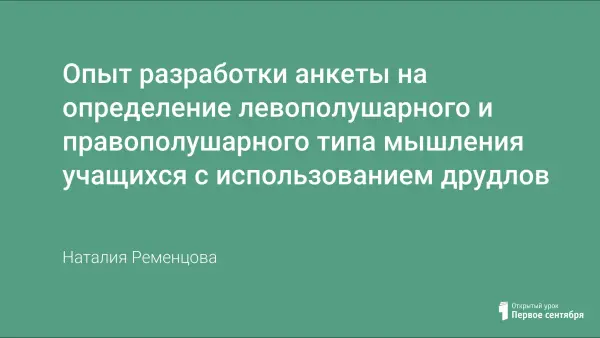 Психологи лицея № 1581 разработали анкету, с помощью которой происходит знакомство с новыми учениками. В качестве стимульного материала используются загадки-головоломки, придуманные английским писателем Р.Прайсом. Были разработаны критерии, по которым можно определить, на какое полушарие мозга опирается ученик при написании рассказа. Кроме того, анкету можно использовать и как проективную методику для определения актуального состояния учащегося.