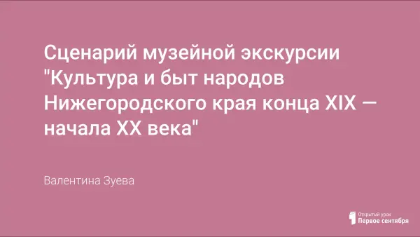 В данной работе представлен сценарий экскурсии по теме «Культура и быт народов Нижегородского края конца XIX — начала XX века». Цель данного мероприятия — приобщение учащихся к своим истокам, корням.