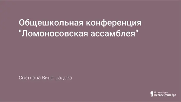 «Ломоносовская ассамблея» – общешкольная конференция, посвященная изучению научного и общепедагогического наследия М.В. Ломоносова. Предваряя конференцию, учащиеся и учителя школы на уроках и во внеурочное время знакомились с жизнью и научной деятельностью просветителя российского образования М.В. Ломоносова. Результатом этой работы стали проекты и презентации, посвященные биографии и научному потенциалу великого ученого.