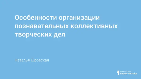 Коллективное творческое воспитание – особый метод организации жизнедеятельности детей, который подразумевает совместную деятельность ребят, направленную на улучшение совместной жизни. Коллективное творческое дело (КТД) является важнейшим и основным структурным элементом методики коллективно-творческого воспитания. Коллективные творческие дела – это «полнокровная жизнь старших и младших, воспитателей и воспитанников и в то же время их общая забота об улучшении окружающей жизни, в которой педагоги выступают как старшие товарищи ребят, действующие вместе с ними и впереди них». Важнейшие особенности: практическая направленность, коллективная организация и творческий характер проведения. Каждое коллективное творческое дело есть выражение заботы воспитанников и об улучшении окружающей и своей жизни. КТД – жизненно важное, общественно необходимое дело. Оно является коллективным, потому что планируется, собирается, готовится, выполняется и обсуждается совместно со всеми участниками, т.е. воспитанниками и воспитателями. Так же оно является творческим, потому что планируется, собирается, готовится, выполняется и обсуждается постоянно в новом виде, в результате поиска лучших способов, средств решения жизненно важных задач. Данные особенности КТД характеризуют их практическую сторону. Они определяют отличительные оттенки воспитательной стороны. Эта методика предполагает широкое участие каждого участника в разработке и выборе, в проведении и анализе коллективных дел.
