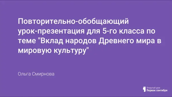 Урок для 5-го класса по всеобщей истории, посвященный культуре Древнего мира, строится по традиционной схеме урока-презентации, разработан в соответствии с современными требованиями к уроку. Проводится в форме интеллектуальной игры с использованием приемов сравнения, обобщения, противопоставления; индивидуальной и коллективной (в группах) форм работы, возможности выбора учащимся подходящего для него вида деятельности.