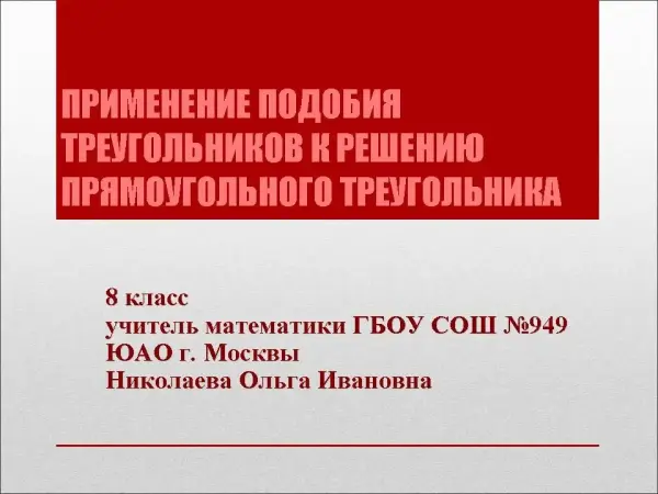 В работе представлена презентация, которая может быть использована при объяснении нового материала как на уроке по теме «Применение подобия к доказательству теорем и решению задач», так и при первичном закреплении материала учебника, связанного с пропорциональными отрезками в прямоугольном треугольнике, а также на этапе первичного контроля, по усвоению материала.