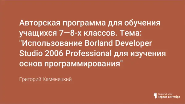 Новая интегрированная среда разработки Borland Developer Studio 2006 Professional, поступившая в школы в составе стандартного базового пакета лицензионного программного обеспечения (СБППО) может быть использована для обучения учащихся 7–8-х классов основам программирования. Знакомство с этой средой разработки вызвано большой её популярностью у профессиональных программистов.
