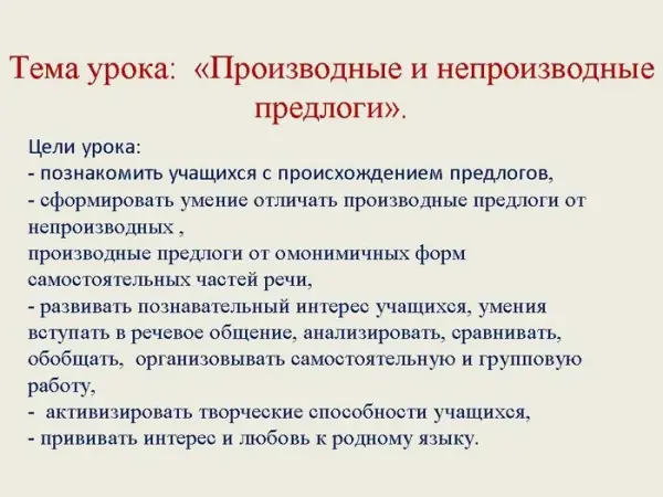 Урок знакомит учащихся с происхождением предлогов. Формирует умение отличать производные предлоги от непроизводных, производные предлоги от омонимичных форм самостоятельных частей речи. Развивает познавательный интерес учеников, умение вступать в речевое общение, анализировать, сравнивать, обобщать, организовывать самостоятельную и групповую работу; активизирует творческие способности учащихся, прививает интерес и любовь к родному языку.
