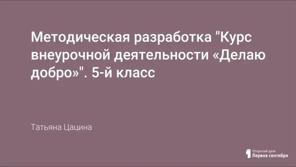 Методическая разработка «Курс внеурочной деятельности «Делаю добро» посвящена проблеме формирования базовых социальных компетенций, интеллектуальных умений обучающихся. Данная методическая разработка предназначена для обучающихся 5-х классов. Данная программа ориентирует молодежь на социально значимые понятия нашего общества – добро, милосердие, помощь ближнему, волонтерство. Формирует социальные компетенций и гражданские установки, способствует овладению опытом решения реальных практических дел, вовлечение суворовцев в социальную проектную деятельность, развитие умения согласовывать личные и общественные интересы.