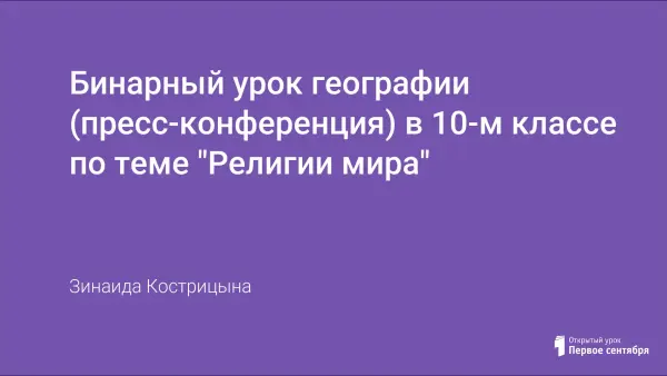 Урок состоит из двух частей: знакомство с конфессиями (материал взят из книги "Религии мира" под ред. Я.И. Щапова. М.: Просвещение, 1994) и ответы на вопросы журналистов. Вопросы были подготовлены заранее, чтобы представители конфессий могли найти ответы в различных источниках информации. На уроке использовалось 2 презентации — "Христианство" и "Религия и современность", выполненные учащимися.