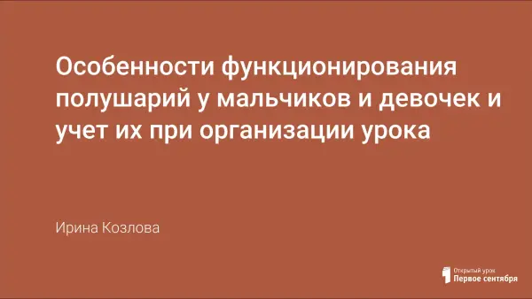 В данной работе раскрыты специфические особенности мальчиков и девочек младшего школьного возраста, зависимость их от созревания левого и правого полушарий, предлагаются методические средства при организации учебно-воспитательного процесса.
