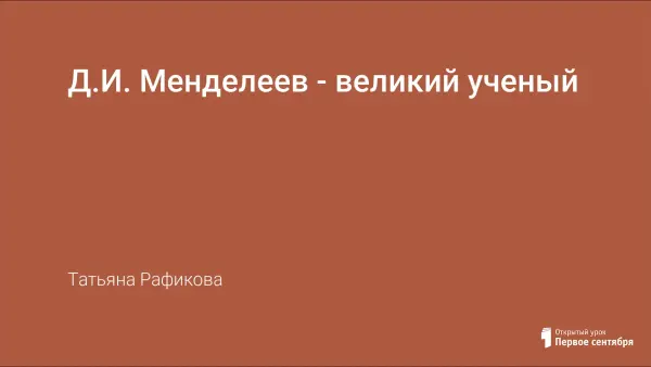 Вашему вниманию предлагается разработка урока, посвященная великому ученому Д.И. Менделееву. В ходе урока рассмотрена биография и основные этапы его научной деятельности, его сотрудничество с учеными других стран. Через содержание учебного материала идет воспитание интереса к изучению жизни и научной деятельности ученого, воспитание патриотизма и гордости за выдающихся людей.