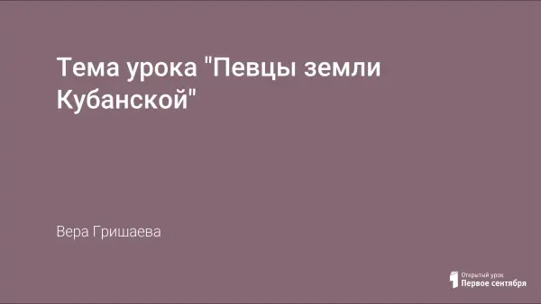 Уникальна и самобытна музыкальная культура Кубани. Целью данного урока является формирование и расширение представлений о музыкальной культуре родного края, о связи народной песни и авторской, воспитывает любовь и уважение к своей малой родине.