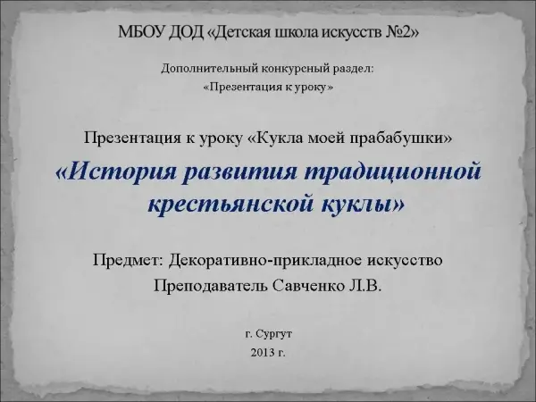 На занятии учащиеся знакомятся с историей народной куклы, русскими обрядами и традициями, связанными с изготовлением куклы. Учащиеся ведут поисковую работу и готовят сообщения по заданной теме. В практической части урока дети изготавливают куклу Желанницу.