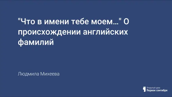 Основой для авторской презентации послужил материал Исследовательского центра МГУ имени Ломоносова «Английские фамилии». Информация адаптирована для школьников 8–11-х классов и является частью интегрированного внеклассного мероприятия (русский язык + английский язык).