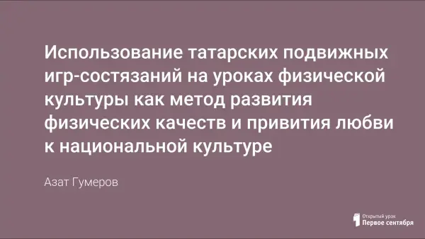 Все свое детство я провел в татарской деревне, но почему-то сейчас, когда я пытаюсь вспомнить наши детские игры, на ум приходят только общеизвестные «Прятки», «Вышибалы» и «Выше ноги от земли». Никакого национального колорита – просто детские забавы с мячом и массовая беготня по двору. Поэтому хотелось более подробно изучить татарские подвижные игры в своей теме самообразования, в последующем применить на практике, то есть на уроках физической культуры. Конкретно разработанных сборников татарских подвижных игры и состязаний для применения на уроках физической культуры я не нашел. Поэтому возникло желание систематизировать имеющиеся игры и собрать их как сборник для дальнейшего внедрения в рабочую программу по физической культуре.