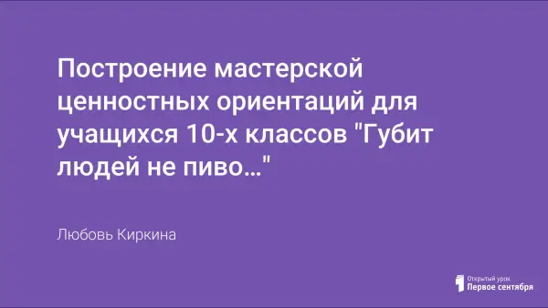 Целью мастерской является профилактика алкоголизма, воспитание жизненной позиции учащихся 10-го класса. Проживание мастерской позволяет каждому учащемуся взглянуть на эту проблему не с позиции "хорошо", "плохо", а через понимание человеческой сущности. Подростки, анализируя образ пьющего человека, решая жизненные ситуации, "примеряют" этот опыт на себя, осмысливают свою жизненную позицию.