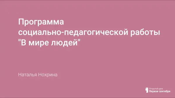 В условиях изменения общественного строя и общественного сознания увеличивается количество различных отклонений в личностном развитии и поведении. Среди них особую тревогу вызывают не только прогрессирующая отчужденность, повышенная тревожность, духовная опустошенность детей, но и их цинизм, жестокость, агрессивность. С целью: оказания социально-педагогической помощи несовершеннолетним разработана программа "В мире людей".