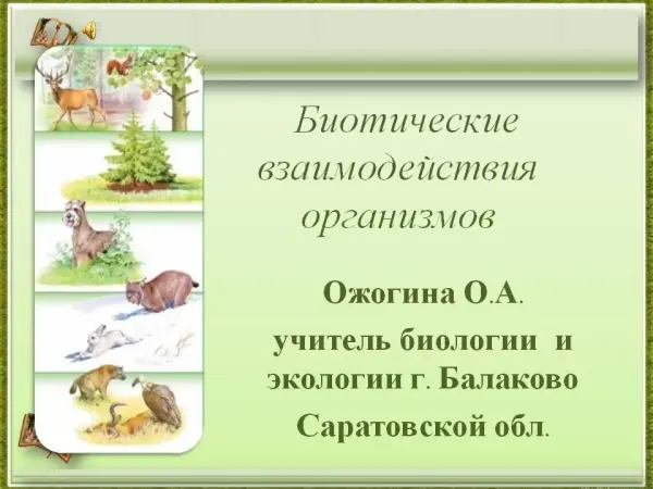 Урок по теме соответствует программе «Основы общей биологии», авторы: И.Н. Пономарева, Н.М. Чернова. Презентация наглядно представляет биотические взаимодействия в природе, имеет звуковое сопровождение. Задания для определения типа взаимодействия развивают интерес к биологии.