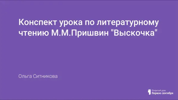 Цели урока: развитие речевых и читательских умений. Задачи урока: познакомить учащихся с произведениями М.Пришвина «Выскочка»; пробудить познавательную активность; работать над осознанностью чтения, над читательскими умениями; расширять кругозор учащихся, развивать речь, наблюдательность, умение анализировать прочитанное; развивать критическое мышление; воспитывать любовь ко всему живому.