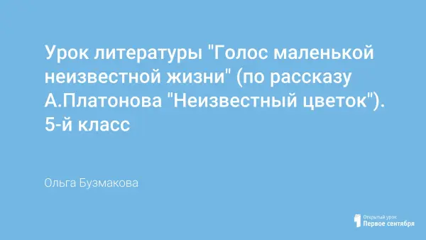 Представлен материал, включающий разработку открытого урока литературы в 5-м классе по теме «Голос маленькой неизвестной жизни» (по рассказу А.Платонова «Неизвестный цветок»). На уроке учащиеся вместе с учителем делают открытия, учатся вести диалог, работать в группах, а также расширяют свое представление о любви как о милосердии, уважении, доброте, дружбе, умении сопереживать. Занятие сопровождается презентацией и завершается творческой работой.