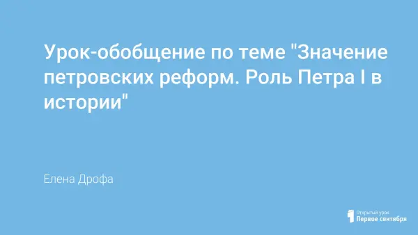 Урок разработан для 7-го класса и направлен на создание условий для рассмотрения и оценки деятельности Петра I. Данная форма урока позволяет формировать ценностные ориентации и убеждения на основе сравнения положительного и отрицательного результата деятельности Петра I в условиях необходимости модернизации государства.