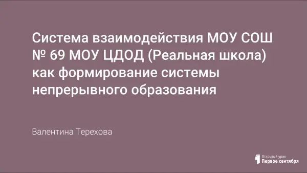 Задача школы не только дать учащимся определенный багаж знаний, но и вооружить их социальным оптимизмом. Решить эту задачу школа может только в условиях интеграции с учреждениями социума. Но наиболее оптимальные возможности представляет сотрудничество с Центром дополнительного образования (Реальная школа). В процессе интеграции школы и ЦДОД (Реальная школа) реализуется своеобразная модель сетевого взаимодействия.