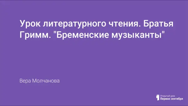 Цели урока: знакомство с творчеством братьев Гримм, жанром сказки и видами сказки. Обучение сознательному, выразительному прочтению произведения; приобщение к художественному творчеству, развитие речи учащихся; обогащение словарного запаса.