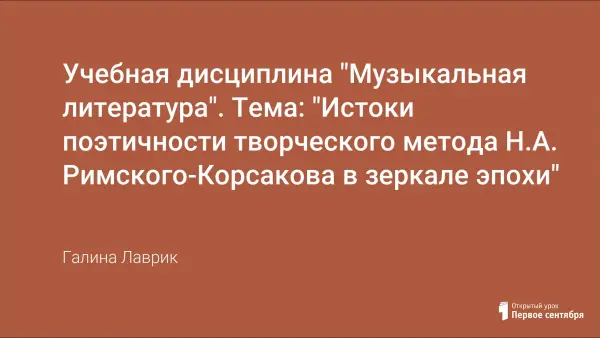 Представленный урок - обобщающий анализ творчества Римского-Корсакова и вводный к теме "Серебряный век в русской музыкальной культуре". В течение урока студенты выполняют различные задания: интерпретируют тексты первоисточников, составляют опорную схему к обобщающей теме, анализируют музыкальные произведения и живописные полотна, сводные характеристики стилей в искусстве, что приводит к выявлению их сущностных особенностей.