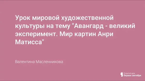Урок посвящен анализу творчества одного из виднейших представителей авангарда XX века Анри Матисса. Содержит большое количество фактографического материала по теме. Знакомит учащихся с рядом искусствоведческих терминов.