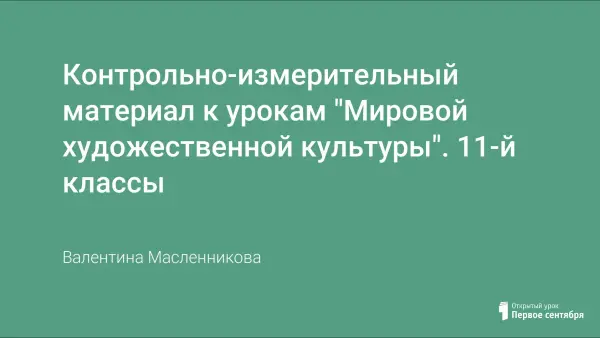 Материал охватывает период культуры от древности до XX века. Его назначение – эффективное использование студентами для оценки своего художественного развития и самоконтроля. Может быть предложен в качестве письменных контрольных работ, домашнего задания, зачётов и семинарских занятий.