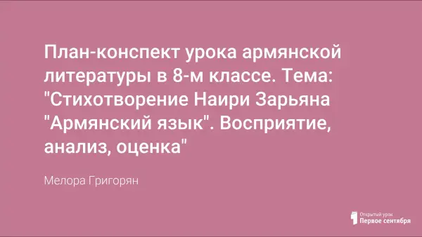 Этот урок проведен в средней школе, в которой преподается армянский язык - родной язык для девчонок и мальчишек хутора Шаумян. Большинство ребят школы никогда не были на своей исторической родине - Армении. Их предки нашли приют в России, в донском краю, еще с царских времен. Они сохранили свою культуру, самобытность и родной язык. С историей родины, языка и культуры знакомлю своих учеников на примерах литературных произведений армянских писателей и поэтов.