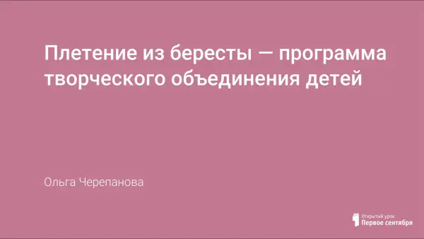 Предлагаемая программа знакомит детей с правилами сбора, хранения и обработки бересты, обучает приемам плетения из бересты, воспитаывает уважение к традиционным русским промыслам. Рассчитана на 72 часа. В содержании программы присутствует четкое разделение на теоретические и практические занятия.