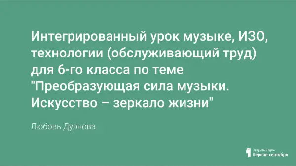 Интегрированный урок даёт учащимся представление о возможных взаимосвязях музыки, литературы, изобразительного искусства, технологии (обслуживающий труд) и выявляет единое начало, исток всей творческой жизнедеятельности людей – жизнь. Данный урок организует творческий процесс: услышал музыку, прочувствовал её (пропустил через себя), выразил своё отношение через творческую работу (рисунок, вышивка, сочинение стихов).