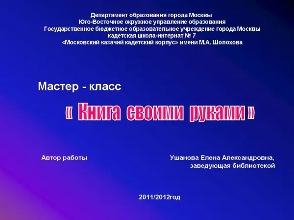 «Мастер-класс. Книга своими руками» ‒ долгосрочный проект по созданию книги, рассчитан на несколько библиотечных уроков. Презентация служит пособием для создания «своей книги» в школе или дома. Проект можно провести с детьми разного возраста в зависимости от сложности поставленных задач (содержание, объем, формат, способ изготовления книги).