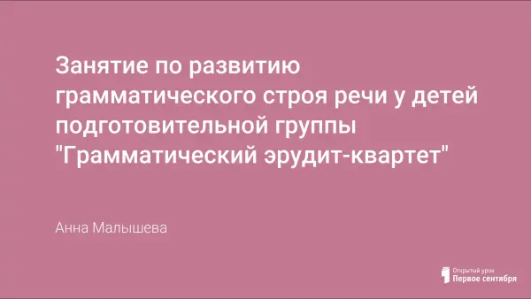 В статье содержится конспект занятия по развитию грамматического строя речи у детей подготовительной группы "Грамматический эрудит-квартет". Одна из задач занятия – совершенствовать умение образовывать (по образцу) однокоренные слова, существительные с суффиксами, глаголы с приставками, прилагательные в сравнительной и превосходной степени.